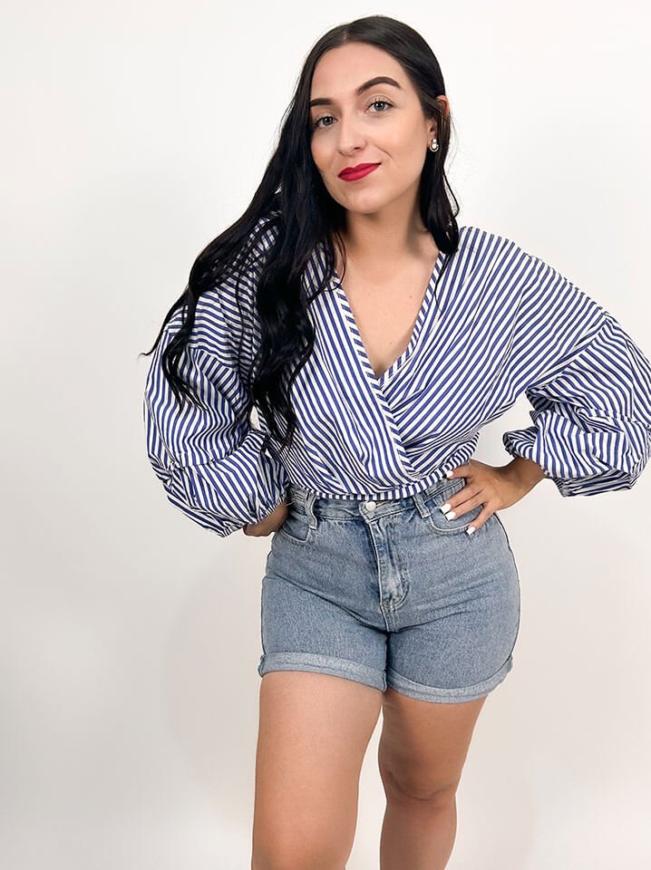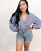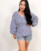 Observaciones: Blusa blanca con rayas azules, cuello con escote, mangas holgadas en la cintura tiene un pequeño resorte.